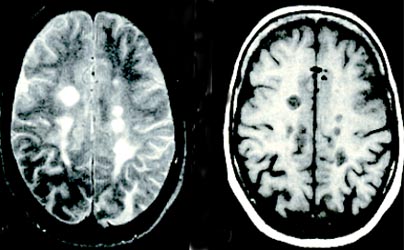 O diagnóstico definitivo de EM passa pela demonstração de disseminação temporo-espacial de lesões inflamatórias na substância branca do SNC. Para além da clínica a disseminação espacial destas lesões pode pôr-se em evidência recorrendo a técnicas neurofisiológicas (Potenciais Evocados Multimodais) e de Imagem (RNM). Embora as imagens não sejam específicas, a RNM revela lesões encefálicas em cerca de 98% de doentes com diagnóstico definitivo (Fig. 3).