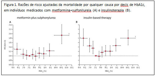 O referido estudo verificou que valores medianos de HbA1c, de cerca de 7,5%, em doentes com DM 2 submetidos a terapêuticas intensivas com ADO combinados ou insulina, estão associados a um menor risco de mortalidade por todas as causas. Valores superiores ou inferiores a este estarão associados a um maior risco.