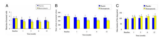 Foram incluídos 115 doentes no estudo (58 no grupo placebo e 57 no grupo Desmopressina). Como podemos verificar nos gráficos apresentados abaixo, a Desmopressina reduziu a produção nocturna de urina e o número de episódios de noctúria, tendo também prolongado o período de sono até ao primeiro episódio de necessidade do doente se levantar para urinar.