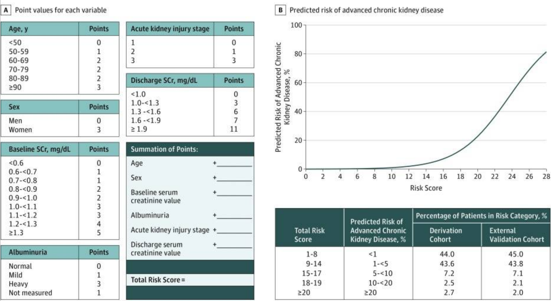 Conclusão: Um score com 6 variáveis que usa variáveis demográficas e dados laboratoriais foi capaz de prever com precisão o risco de progressão para doença renal crónica após episódio de lesão renal aguda durante o internamento.