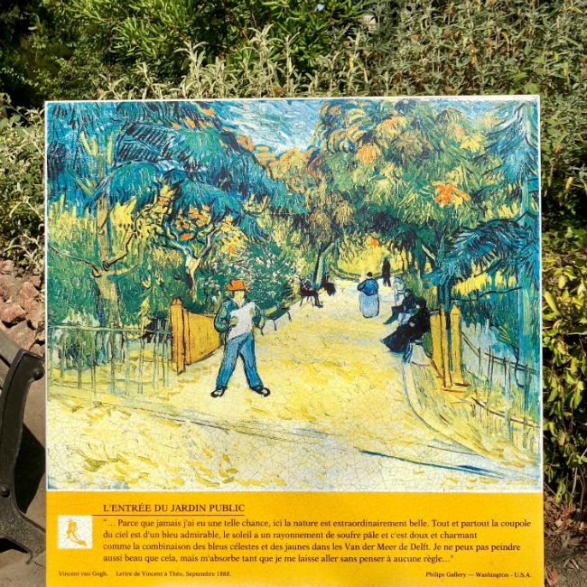 Muitos dos pontos onde Vincent terá pintado os seus quadros, estão sinalizados com um painel informativo que contém também uma imagem do quadro ali pintado. No final deste texto, destaco e partilho alguns dos principais pontos que visitei: “Terrace of a café at Night (Place du Forum)”, “Starry Night”, “Entrance to the public gardens in Arles” e “Le jardin de la maison de santé a Arles”. Passo a passo, pensamento a pensamento, pelas ruas de Arles, ocorre-me a turbulência da tua mente, Vincent, a compulsão com que pintavas, o teu sofrimento, mas também a alegria inicial e o entusiasmo por cada tela em branco que deixava de o ser. E, claro, a tua genialidade criativa.