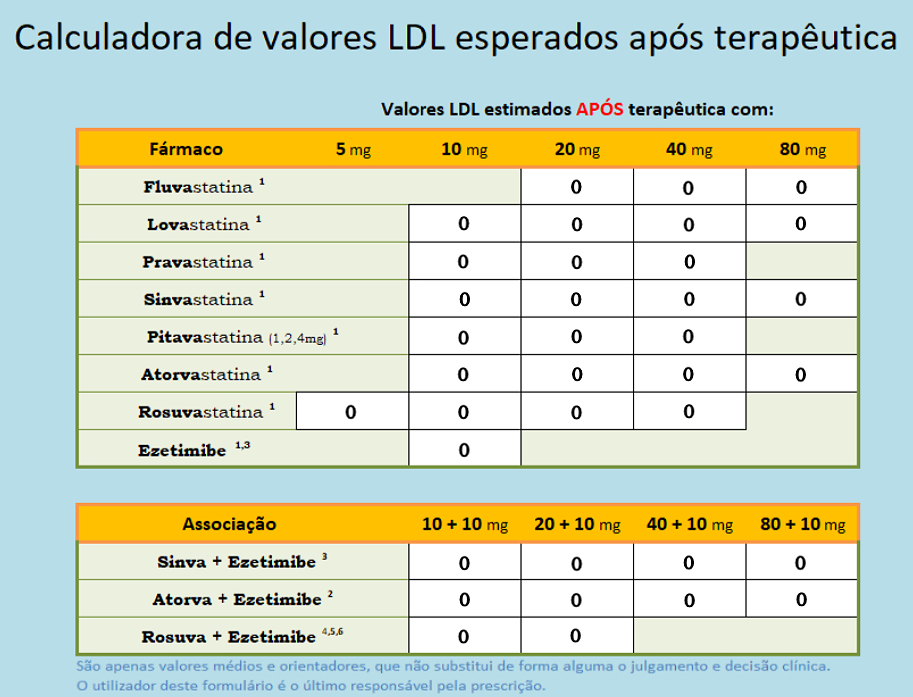 Calculadora partilhada pelo colega Bruno Valentim, interno de Medicina Geral e Familiar da USF Condeixa, que permite estimar o efeito esperado de cada estatina a partir do perfil lipídico do paciente. Desta forma, pode-se escolher a estatina, incluindo a respectiva dosagem, mais adequada ao perfil lipídico do paciente e ao alvo terapêutico pretendido. Um excelente suporte à decisão…