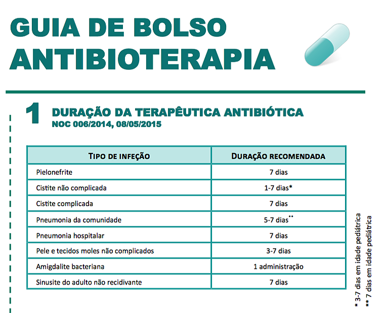 Guia de Bolso de Antibioterapia elaborado pelas colegas Marta Guedes, Joana Macedo, Maria João Xará, Diana Soares, Filipa Carvalho da USF Entre Margens. Orientado para a prática clínica, aborda múltiplas situações como, por exemplo, ITUs, amigdalite, pneumonia… Muito obrigado às autoras pela partilha desta ferramenta.